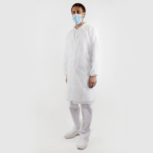 Az ARI eldobható köpeny fehér színű, polipropilén alapanyagból készült. Nyomógombos zárással rendelkezik, klasszikus gallérral és zsebek nélkül. Egy darab van egy csomagban. Ideális választás olyan helyeken, ahol fontos a higiénia és a ruházat védelme.