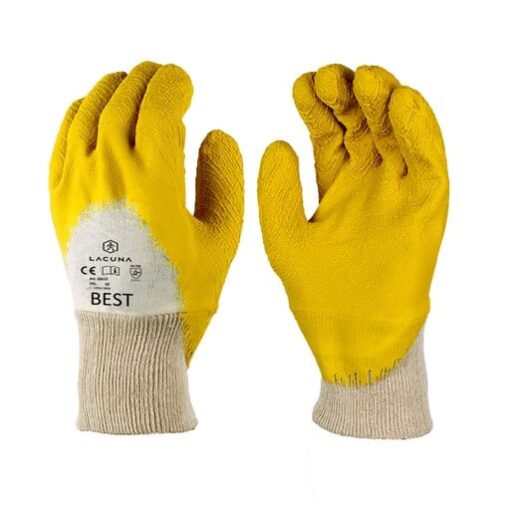 A BEST építőipari kesztyű pamut kötött alapanyagból készült, 3/4 felületen redős latex bevonattal ellátva. EN 388 2131X és EN 420 szabványoknak megfelelő, rugalmas mandzsettával rendelkezik. 10-es méretben kapható, kifejezetten nedves munkakörülményekhez tervezték.
