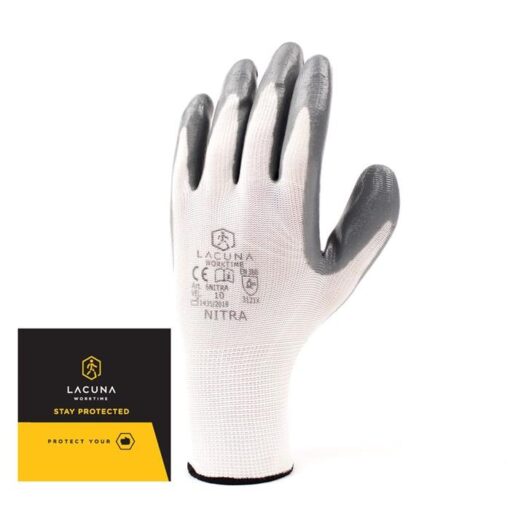 A NITRA nitril bevonatú munkakesztyű poliészter alapanyagból készült, nitril bevonattal a tenyér területén és az ujjbegyeken. EN420 és EN388 (3121X) szabványnak megfelelő védőeszköz rugalmas poliészter mandzsettával.