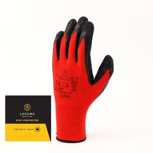 A LUNA latex bevonattal ellátott kesztyű egy kötött alapkesztyű, amelyet precíziós munkákhoz terveztek. Piros nylon kötött anyagból készült, fekete latex bevonattal a tenyéren a jobb fogás és védelem érdekében. A kesztyű megfelel az EN420 és EN388 szabványoknak.