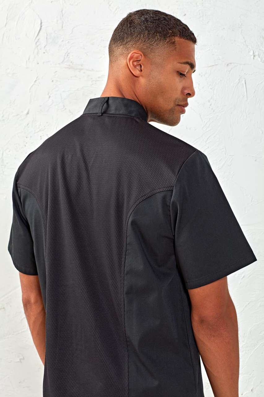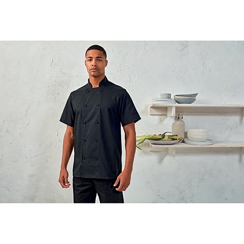 A Premier Chef unisex rövid ujjú szakácsblúz ideális választás professzionális szakácsok és vendéglátóipari dolgozók számára. Ez a blúz kényelmes és praktikus viseletet biztosít a konyhában.