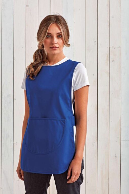A Premier PR171 női tabard kötény egy nyakba akasztható munkaruha, amelyet 195 g/m² grammsúlyú anyagból gyártanak vendéglátóipari szakemberek számára. A termék 7 színben (fehér, bordó, fekete, khaki barna, szürke, királykék, narancssárga) és 6 méretben (S-3XL) kapható, 68 cm-es egységes testhosszal és 44-69 cm közötti mellszélességgel mérettől függően.