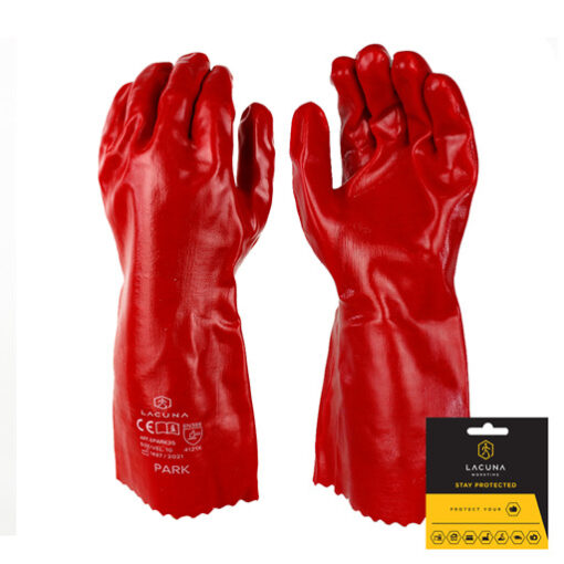A PVC kesztyű PARK 35 cm egy tartós munkavédelmi eszköz, melynek célja a kéz védelme vizes oldatokkal szemben. A kesztyű poliészter/pamut béléssel és vörös polivinil-klorid (PVC) réteggel rendelkezik, biztosítva a jó tapadást és a tartósságot. A 35 cm-es hossz további védelmet nyújt a csuklónak és az alkar egy részének.