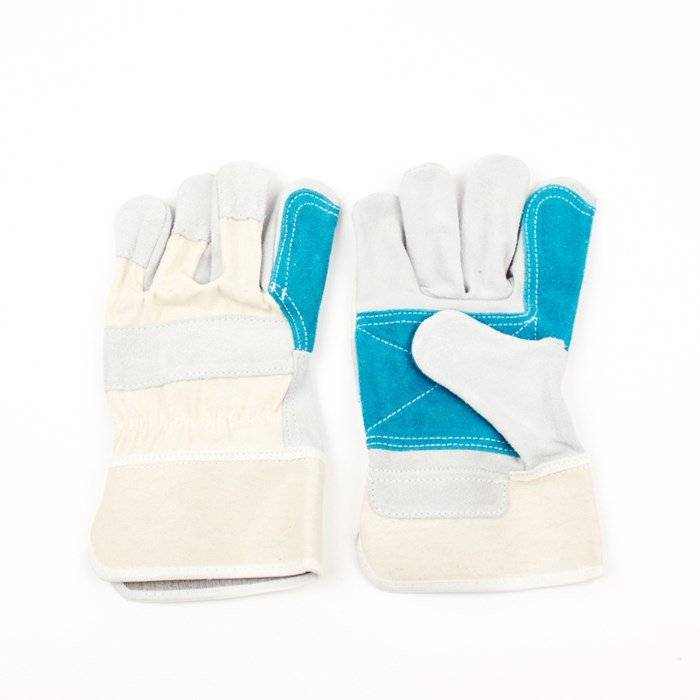 Tehén hasított bőrből készült bőrkesztyű, tenyér és hüvelykujj megerősítésekkel, mutatóujjon egy darabban varrott bőr