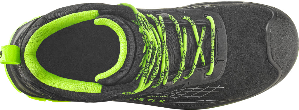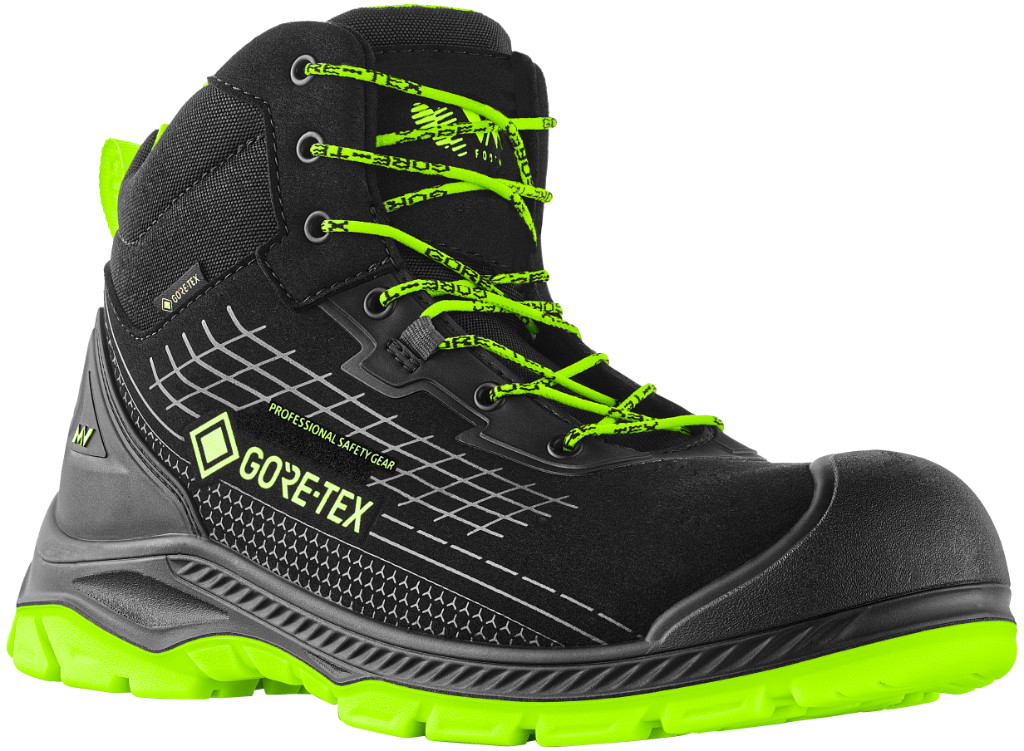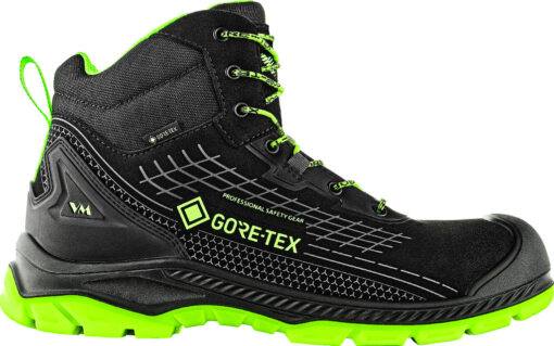 A cipő felső része poromerikus mikroszálas anyagból készült, amely hidrofób (vízlepergető) tulajdonságokkal rendelkezik, és könnyebben tisztítható, mint a bőr. A GORE-TEX® membrán teljes vízállóságot (WR) garantál, így a láb száraz marad nedves körülmények között is. A cipő EN ISO 20345:2022 szabvány szerint tanúsított.